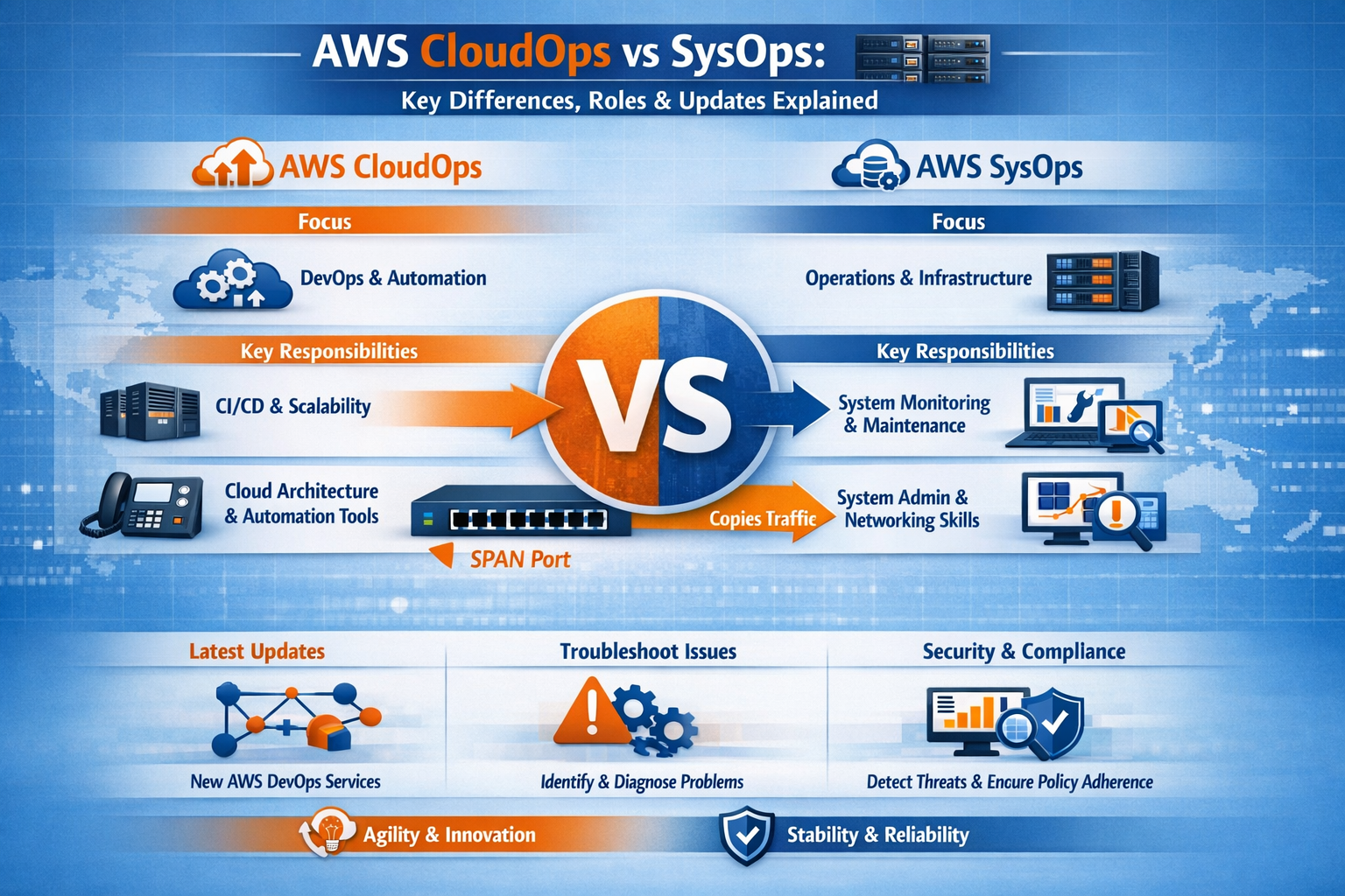 The transition from SysOps to CloudOps represents a deep structural transformation in IT operations rather than a simple terminology update. Traditional SysOps environments were designed around fixed physical infrastructure where system administrators directly controlled servers, storage devices, and network components inside on-premises data centers. Operational tasks were heavily manual and included hardware maintenance, system patching, configuration management, and uptime monitoring. These environments were stable, predictable, and built on the assumption that infrastructure changes were rare and carefully scheduled. Capacity planning followed long procurement cycles, and scaling required purchasing and installing new hardware, which often led to overprovisioning to handle peak demand. Change management processes were rigid, emphasizing caution and stability over speed, and deployments were typically infrequent due to the risks associated with modifying live systems.