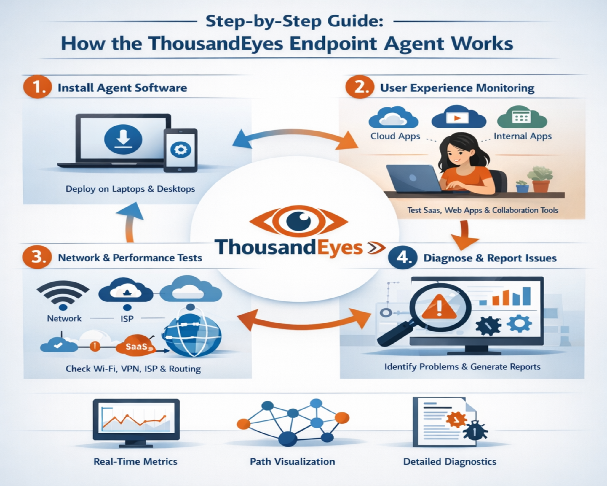 With endpoint-level data, incident response teams can immediately observe the user experience impact and trace the issue backward through the network path. This reverse diagnostic approach eliminates guesswork and accelerates resolution time.
